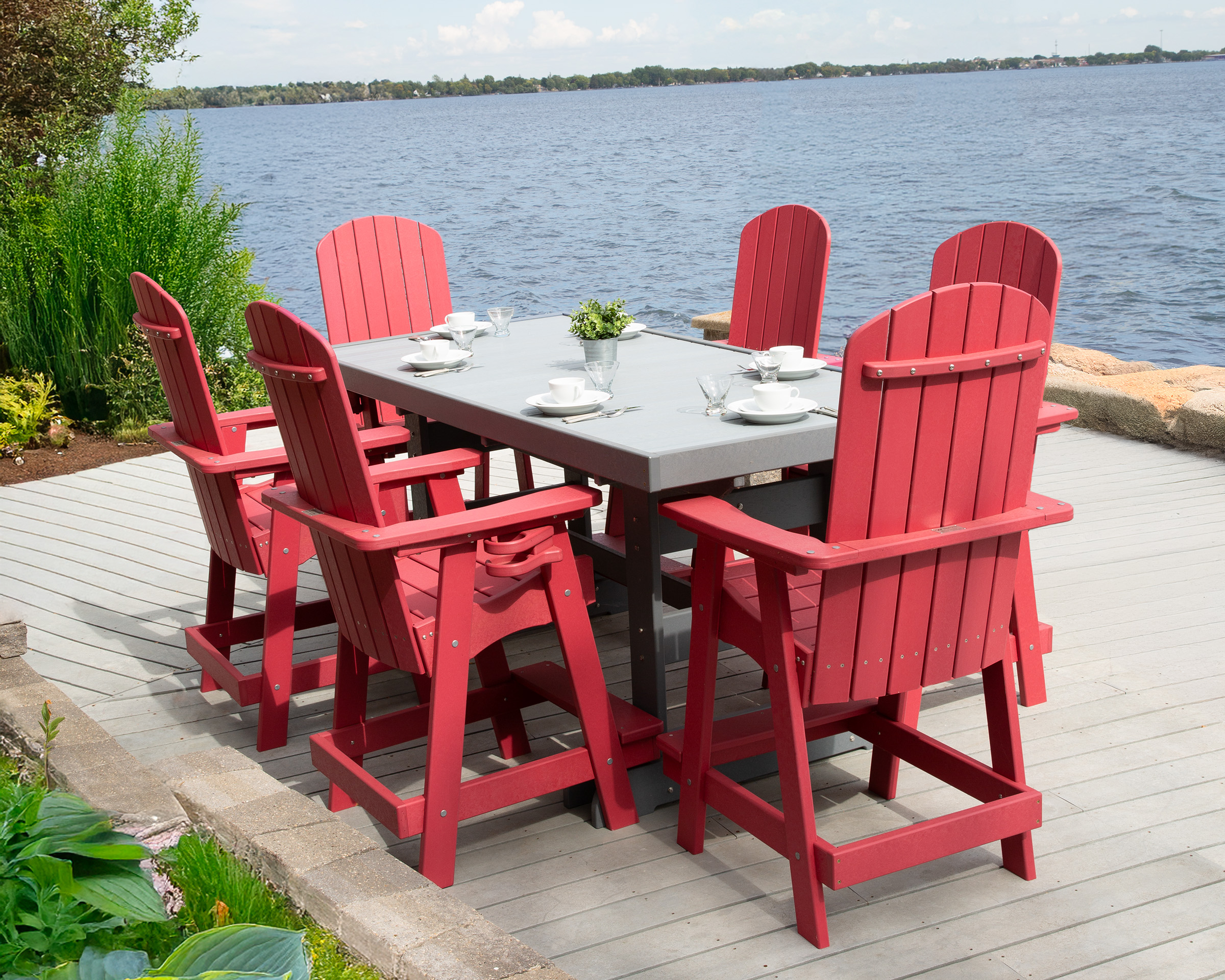 Adirondack chair made of plastic lumber on a wooden deck with white railing, overlooking a lake and surrounded by green trees